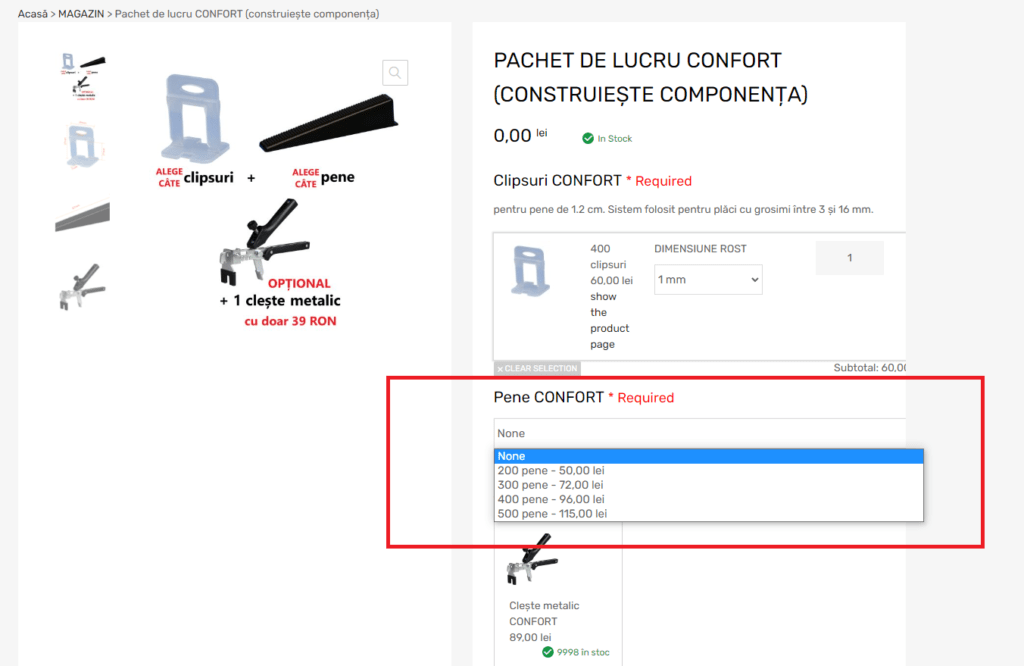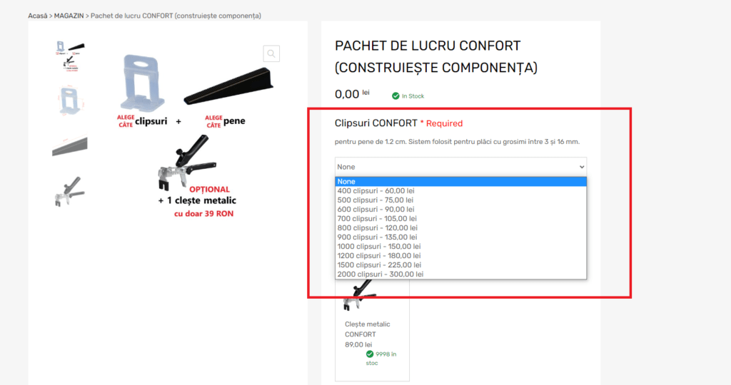 Alegi pachetul de lucru dorit, gama STAR sau CONFORT. Selectezi din lista derulantă cantitatea de  clipsuri și dimensiunea rostului dorit. (camp obligatoriu pentru plasarea comenzii). Daca nu dorești un pachet poți opta oricând pentru fiecare element separat. (pene/ clește / clips)